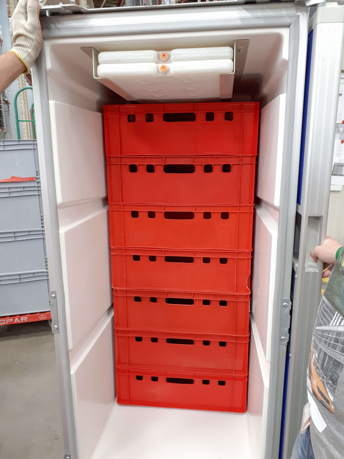 W przypadku naszego kontenera termicznego GEBAHRDT nie ma żadnych ograniczeń w zakresie elastyczności. Jeśli zdecydujesz się na kontener termiczny firmy Gebhardt z chłodzeniem eutektycznym, szyny ślizgowe do mocowania płyt eutektycznych są niemal niezbędne. Stabilne szyny ślizgowe wykonane ze stali ocynkowanej ogniowo znajdują się w górnej części naszych kontenerów izotermicznych i mogą pomieścić do 6 płyt eutektycznych. Jeśli zdecydujesz się na użycie dna pośredniego dla płyt eutektycznych, jest ono wstawiane w górnej części pojemnika i służy do przechowywania płyt eutektycznych w połączeniu z chłodzeniem eutektycznym. Ten typ dna wsuwanego nie stanowi kolejnego poziomu składowania, lecz służy jedynie do przechowywania płyt eutektycznych. Nasze kontenery termiczne można chłodzić za pomocą płyt eutektycznych lub suchego lodu. Jeśli w procesach logistycznych zrezygnujesz z chłodzenia eutektycznego i postawisz na chłodzenie suchym lodem, ta półka pośrednia do suchego lodu jest dokładnie tym, czego potrzebujesz. Kolejna wsuwana półka do podtrzymywania ładunku może służyć jako dodatkowy poziom załadunku. W zależności od wielkości pojemnika, w jego wnętrzu znajdują się tace z wieloma poziomami załadunku.